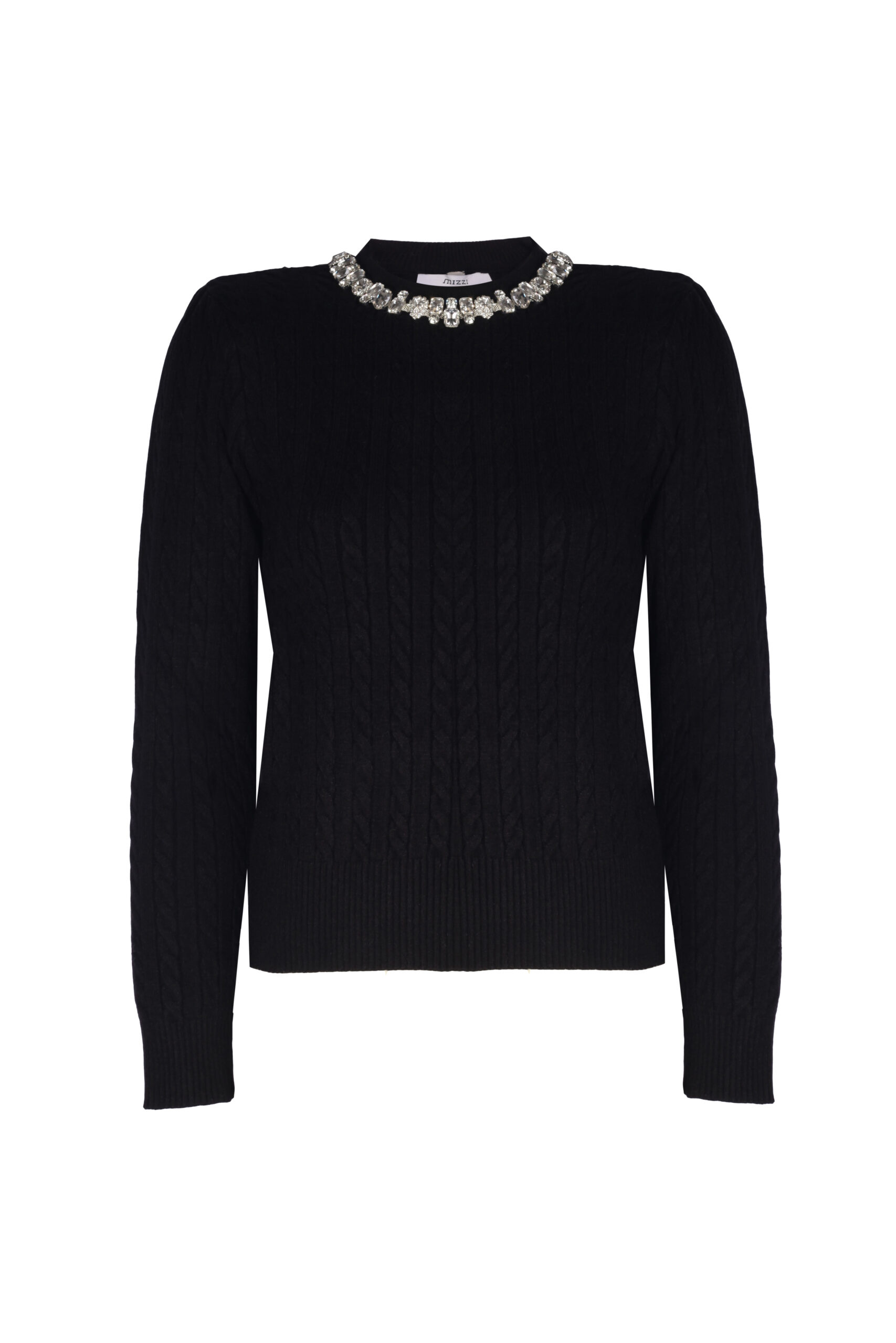Kolyeye ihtiyacınız yok! ✨ Kendall Sweater, klasik saç örgü (örgülü) dokuyu, yaka kısmındaki çarpıcı taş detaylı bordür ile birleştiriyor. Yumuşacık yapısıyla sıcacık tutarken, omuzlardan inen zarif kesimiyle her kombine sofistike bir dokunuş katıyor. Giy-çık lüksün en pratik yolu!