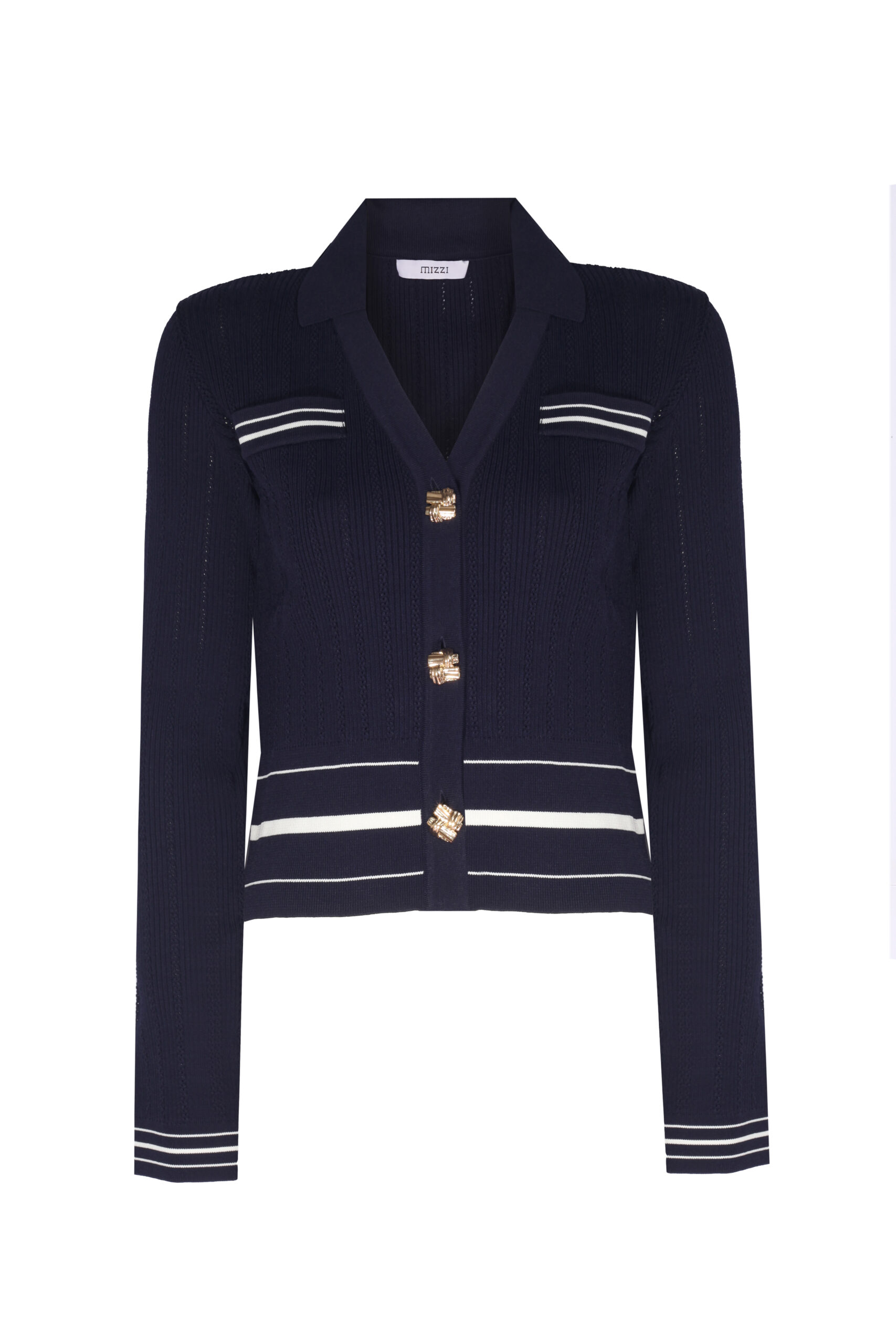 Gardırobunuzun yeni MVP’si! 🏆 Malibu Sweater, lacivertin asaletiyle preppy (okullu) ve lüks havayı birleştiriyor. Beyaz çizgili detaylar, çarpıcı altın düğmeler ve ceket yaka kesimi… Giy-çık şıklığın tanımı! İster jean ile ister ofis pantolonuyla, bu hırka her kombini anında yükseltir.